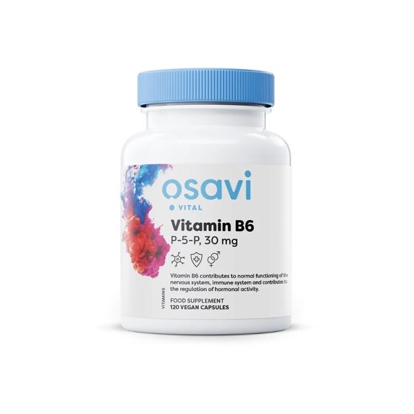 La Vitamina B6 P-5-P 30 mg de Osavi contiene vitamina B6 en la forma activa coenzimática de pirofosfato de piridoxal-5' (P-5-P). Cada cápsula proporciona 30 mg de P-5-P, equivalente a 18 mg de vitamina B6, en un formato clean label vegano, libre de gluten, lactosa, soja y OGM, con solo los ingredientes mínimos e imprescindibles: inulina de achicoria y la cápsula vegetal de hidroxipropilmetilcelulosa.