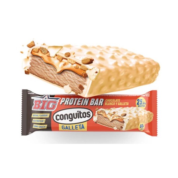 Conguitos Galleta White Protein Bar de Big Nutrition son unas deliciosas barritas proteicas con un núcleo de proteína Lacprodan® by Arla® Foods Ingredients y suave pasta de galleta digestiva, una deliciosa lengua de sirope de galleta coronada por una capa con topping de auténticos trozos de Conguitos® Galleta y, finalmente, un generoso baño del mejor chocolate blanco Big® original sin azúcares añadidos.