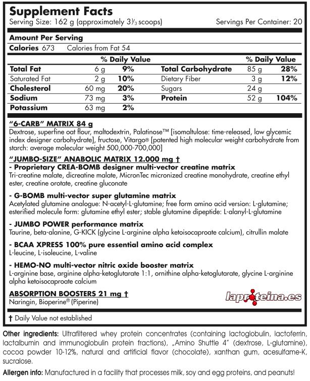 Jumbo Professional incluye 12 gramos por servicio de la extraordinaria matriz anabolica “JUMBO-SIZE” que incluye en su fórmula: