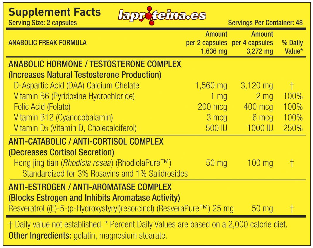 La fórmula de Anabolic Freak™ contiene el poderoso complejo Anabolic hormone/Testosterone Complex científicamente diseñado para incrementar de forma natural la secreción de la testosterona, la hormona más poderosa para la construcción muscular.