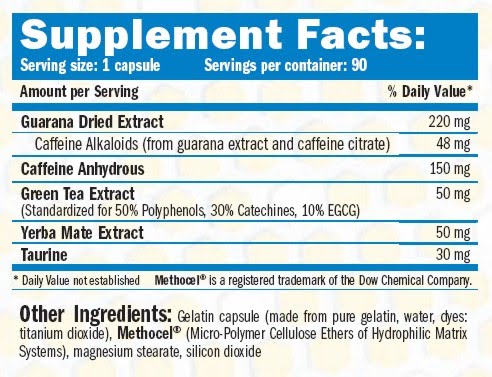 Extracto de guarana, cafeína anhidra, cápsula de gelatina (a base de gelatina pura, agua, colorantes: Dióxido de titanio), extracto de té verde, extracto de yerba mate, taurina, methocel (Micro-polímero hidrofílico éteres de celulosa de sistemas de matriz), antiaglomerantes: Estearato de magnesio, dióxido de sicilio.