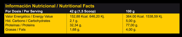 Aislado de proteína de suero de leche hidrolizada, peptidos de glutamina 3.496 mg, aromas: chocolate en polvo desgrasado en sabor chocolate, vainilla en sabor vainilla, edulcorantes: sucralosa, sacarina sódica.