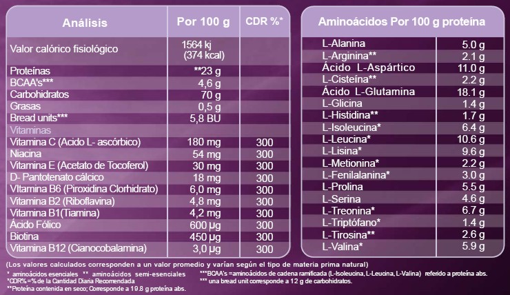 **Proteína contenida en seco; Corresponde a 19.8 g proteína abs.