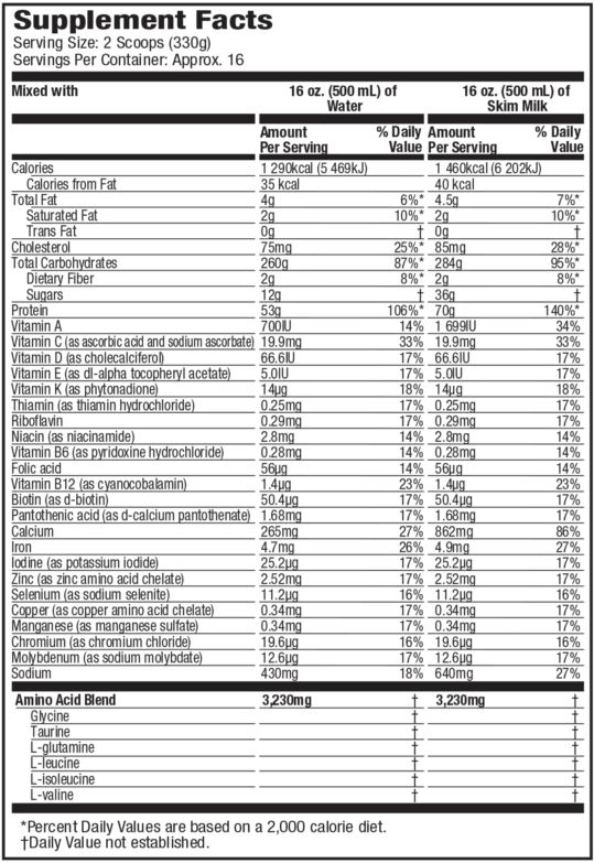 Como suplemento dietético para adultos sanos, añadir dos cazos (56 gramos) a 340 ml de agua fría o leche, mezclar enérgicamente en un shaker o batidora, y tomar preferentemente después del entrenamiento.