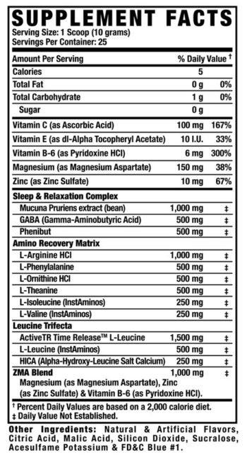 Sleep & Relaxation Complex (Extracto de Mucuma Pruriens, Ácido Gamma-Aminobutírico, Fenibut), Amino Recovery Matrix (Clorhidrato de L-Arginina, L-Fenilalanina, L-Ornitina HCl, L-Teanina, Isoleucina, Valina, Leucine Trifecta (ActiveTR Time Release® L-Leucina InstAminos, L-Leucina, Ácido Alfa Hidroxi-Isocaproáto)), ZMA Blend (Magnesio (Aspartato de Magnesio), Sulfato de Zinc, Vitamina B6 (Hidrocloruro de Piridoxina)), Vitamina C (Ácido Ascórbico), Vitamina E (Acetato DL-Alfa Tocoferilo), Vitamina B6 (Hidrocloruro de Piridoxina,