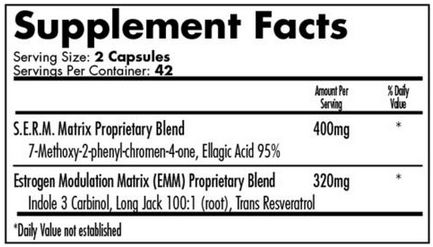 Matriz patentada S.E.R.M. (7-MF, 7-metoxi-2-fenil-cromen-4-ona, Ácido elágico 95%), Matriz patentada de modulación de estrógenos (EMM) (Indole 3 Carbinol, raíz de Long Jack 100:1, Trans Resveratrol).