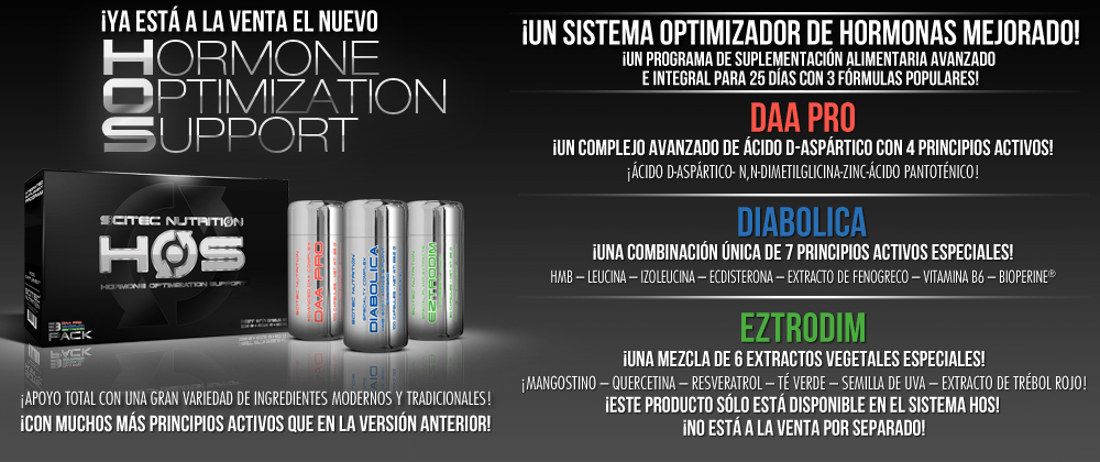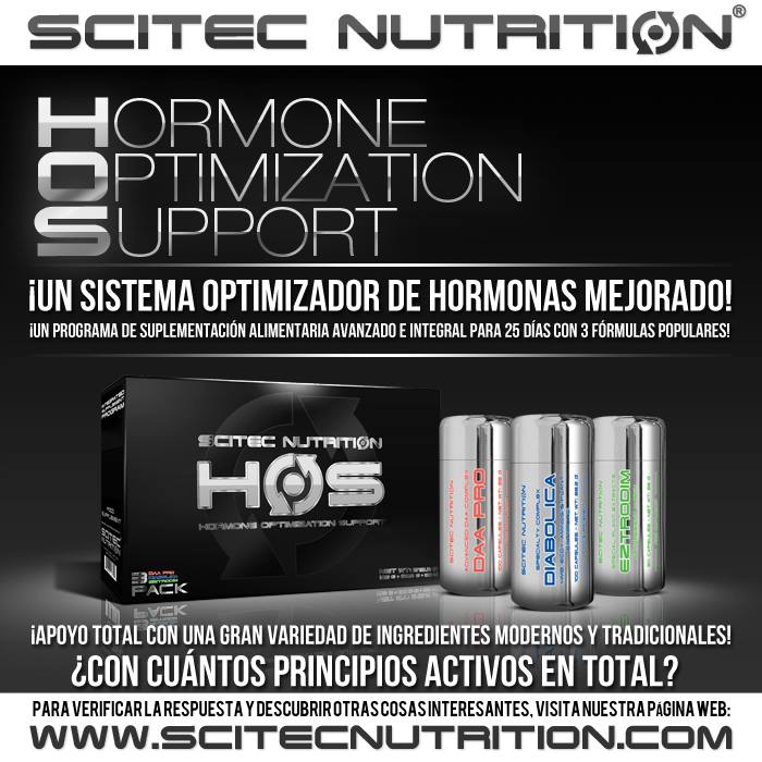 HOS de Scitec Nutrition es el sistema optimizador hormonal más potente del mercado que maximiza el funcionamiento hormonal de tu organismo, a la vez que se ponen en marcha de un modo espectacular todos los procesos de construcción muscular y de conservación de la musculatura.