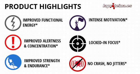 Básicamente, aumentar las concentraciones de fosfocreatina en el músculo, bloqueando el ácido láctico y amplificando los iones de hidrógeno (H+) durante el entreno. Además le proveerá de una concentración y enfoque mental máximos sin que hayan bajones de energía durante el ejercicio.