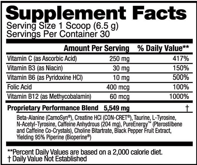 CarnoSyn® (Beta Alanina), Creatina HCL (Con-Cret®), Taurina, L-Tirosina, N-Acetil Tirosina, Cafeína Anhidra, PureEnergy™ (Pterostilbeno, Cafeína), Colina Bitartrato, Pimienta Negra (Extracto) Piperina (95%) (BioPerina®), Ácido Ascórbico, Niacina, Hidrocloruro de Piridoxina, Ácido Fólico, Metilcobalamina.