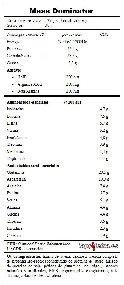 como un complemento dietético para adultos, mezclar 3 dosificadores (125 grs) de Mass Dominator con 500 ml de agua fría en un mezclador.