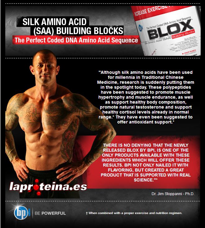 Blox de BPI Sports es un suplemento de aminoácidos de seda (denominados en inglés Silk Amino Acids - SAAs).
