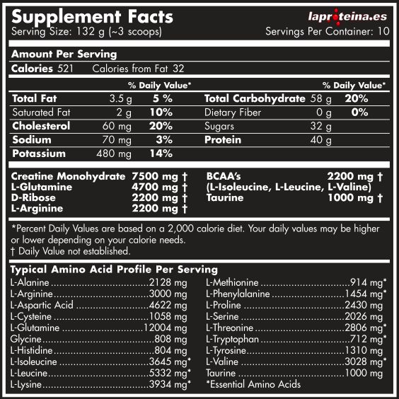 - Incluye una matriz anabólica de aminoácidos (bcaas, glutamina, arginina y taurina).