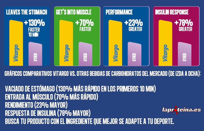 En estudios con humanos demostró ser 70% más efectivo que bebidas con dextrosa o Maltodextrina. En carga de glucógeno el Vitargo® es 70% más rápido. Con estómago vacío el Vitargo® desaparece un 80% más rápido.