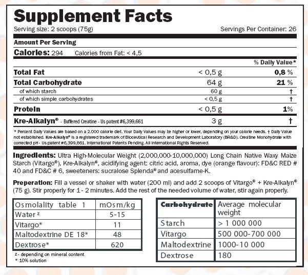Vitargo® Kre-Alkalyn® también incorpora Kre-Alkalyn®, una creatina de última generación que tiene un pH más alto que la creatina monohidrato convencional, por lo que tiene un periodo de absorción y conversión mas lento y debido a ello sus efectos son más prolongados. Esta creatina siempre permanece estable hasta su completa introducción en las células musculares. Sus efectos más notables son un aumento de la fuerza máxima, una mejora de la fuerza explosiva, un aumento de la hipertrofia o crecimiento muscular así como una mayor congestión muscular durante los entrenamientos.