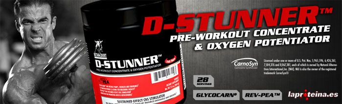 D-Stunner™ no actúa así. D-Stunner™ te ofrece una avanzada mezcla estimulante denominada "CNS (Central Nervous System)" más potente de las que puedas encontrar en cualquier suplemento de pre-entreno hoy en día que te proporciona una experiencia de energía sostenida sin ningún tipo de bajones repentinos junto con otra explosiva matriz denominada "Performance" que es capaz de mejorar el rendimiento, la capacidad aeróbica, la fuerza y los niveles de óxido nítrico gracias a una mejora de la resistencia muscular y de la producción de óxido nítrico durante el ejercicio.