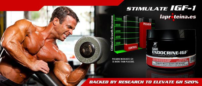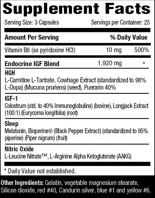 Endocrine-IGF™ contiene: L-Carnitina L-Tartrato que las investigaciones han probado que mejora la recuperación después del ejercicio. Puerarin que según afirman ciertas investigaciones es capaz de elevar los niveles de la hormona de crecimiento un 520%. L-leucina-Nitrato que según las investigaciones ha probado que eleva la respuesta anabólica del cuerpo. Este análogo nitrado de la leucina también aumenta el flujo de sangre junto con la L-Arginina (AAKG) para la estimulación de la hormona de crecimiento. También es muy importante el aumento de la IGF-1 (factor de crecimiento similar a la insulina) que se ve reforzada por la utilización del extracto de Eurycoma Longifolia y el calostro bovino.