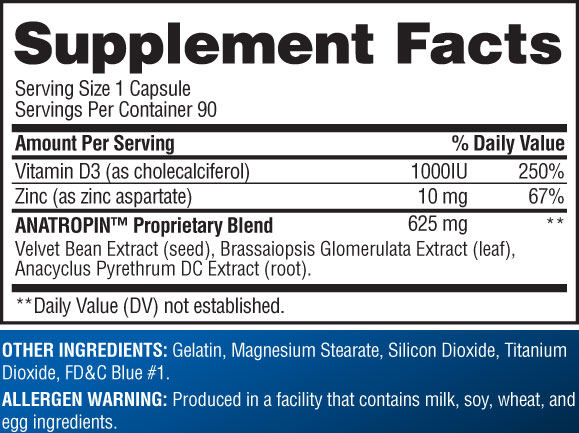 Anatropin™ contiene unas altas dosis de Vitamina D3 y Zinc ya que está probado clínicamente su eficacia dentro de una fórmula potenciadora de la testosterona.