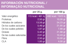 Maltodextrina, grasa vegetal no hidrogenada, harina de trigo, proteína de suero ultrafiltrada, dextrosa, glucomanan, malitol (7,88%), manteca de cacao, aceite CLA (4%), inulina, leche descremada en polvo, emulgente, (lecitina de soja y polirricinoleato de poliglicerol), espesante (goma guar), gasificantes (bicarbonato amónico y bicarbonato sódico), y aromas.