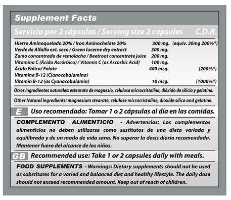 La vitamina C, la vitamina B12, el extracto seco de verde de alfalfa, el zumo concentrado de remolacha y el ácido fólico añadidos ayudan a aumentar la absorción y la asimilación del hierro, por lo que es uno de los complementos alimenticios de hierro más eficaces en el mercado.