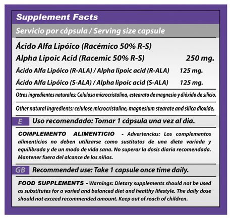 Además, el Ácido Alfa Lipoico imita a la insulina y ayuda a estabilizar los niveles de azúcar en la sangre (glucemia).