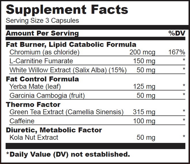 L-carnitina-L-tartrato, incrementador de volumen (fosfato dicálcico), cubierta de cápsula de gelatina, extracto de hoja de Camellia sinensis (té verde), extracto de hoja de Ilex paraguariensis (yerba mate), cafeína, extracto de corteza Salix alba (sauce blanco), extracto de fruta Garcinia cambogia, extracto de semilla de Cola nitida (nuez de cola), antiaglomerantes (estearato de magnesio, dióxido de silicio), cloruro de cromo.