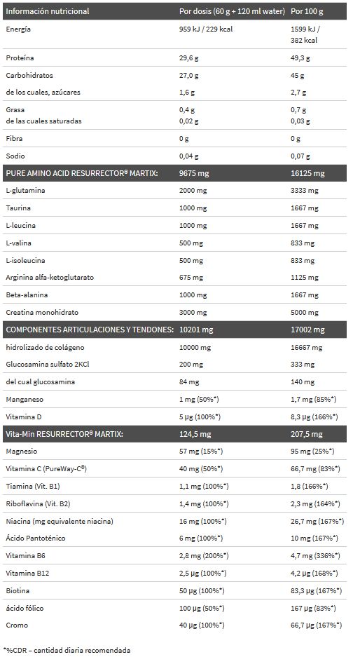 La adecuada regeneración del tejido conectivo después del entrenamiento es muy importante, por eso Resurrector™ ha sido adicionalmente enriquecido con una alta dosis de colágeno, glucosamina sulfato y las vitaminas y minerales necesarios. Estos compuestos ayudan a la regeneración de las micro-lesiones en las estructuras articulares, ligamentos y tendones después de un entrenamiento intenso.