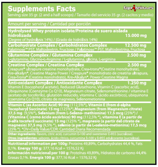 La mejor proteína que puedes encontrar hoy en día, Hydrolysed Whey protein isolate con un grado de hidrolisis del 14%, junto con una matriz de carbohidratos denominada Carbohydrate Complex que incluye Palatinosa™ PST, Maltodextrina y fructosa.