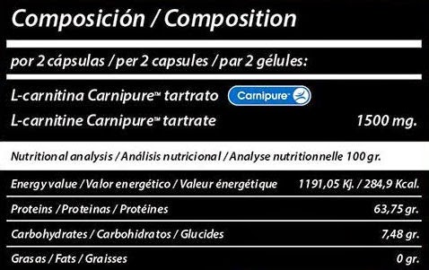 L-Carnitina 1500 de Vit.O.Best contiene L-Carnitina tartrato de L-Carnipure® que es la carnitina de mayor calidad del mercado. Cada servicio de 2 cápsulas proporciona 1.500 mg de L-Carnitina tartrato por lo que se trata de un suplemento de una alta potencia.