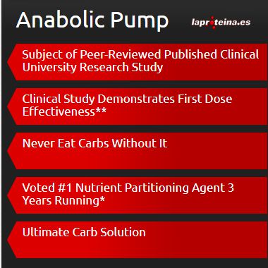 Al controlar la potencia de la insulina y el alimento, ANABOLIC- PUMP™ lleva el crecimiento NATURAL a niveles INCREÍBLES. La insulina es la hormona anabólica más poderosa producida por el cuerpo, mientras que el alimento constituye los ladrillos metabólicos que construyen el tejido muscular. Los físicoculturistas profesionales reciben insulina y consumen increíbles cantidades de comida para obtener un RAPIDO aumento en la fuerza y el tamaño muscular. Sin duda, la insulina obliga al musculo a desarrollarse RAPIDO. Desgraciadamente, la insulina también obliga a las CÉLULAS GRASAS a crecer MAS RÁPIDO. Así terminamos con una INMENSA masa de músculo cubierta con una GRUESA capa de GRASA. Si viviéramos en un mundo perfecto, las células adiposas serían RESISTENTES a la acción de la insulina. Con ANABOLIC-PUMP hemos creado ese mundo perfecto, o por menos el suplemento perfecto.