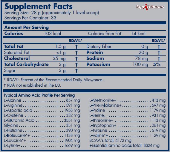 Aislado de proteína de suero. Es una proteína de asimilación ultra-rápida. Gracias a su método de extracción a través de membranas se aísla la proteína de suero de forma natural, sin desnaturalizar sus fracciones activas, con lo que se obtiene un producto limpio y totalmente natural, libre de grasa, colesterol y lactosa. Este sistema permite obtener un aislado de suero muy soluble, con un excelente sabor y con un contenido de entre el 93% y el 95% de proteína funcional.