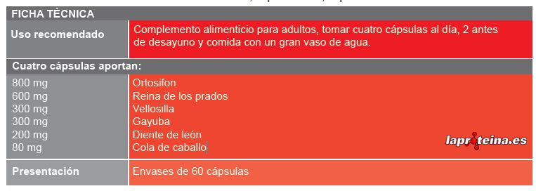 Extracto seco de ortosifon, extracto seco de reina de los prados, extracto seco de vellosilla, extracto seco de gayuba, extracto seco de diente de león, extracto seco de cola de caballo, bicarbonato potásico, cloruro de magnesio, excipiente c.s.p.