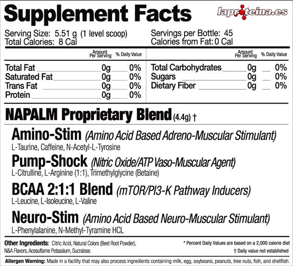 Este complejo que incluye a la taurina, la cafeína y la N-acetil-L-tirosina. Bajo la denominación de Amino-Stim (Amino Acid Based Adreno-Muscular Stimulant) se incluye una matriz que nos proporciona una intensa estimulación muscular y de los receptores adrenérgicos. Napalm ha sido especialmente diseñado para aprovechar el poder estimulante de unos aminoácidos específicos y de sus metabolitos, que amplifican los efectos metabólicos de la cafeína. Esta mezcla de aminoácidos altamente específicos ayuda a estimular el aumento de la adrenalina y la noradrenalina, junto con otros neurotransmisores, para apoyar un mejor estado de ánimo y una mayor liberación de la energía física.