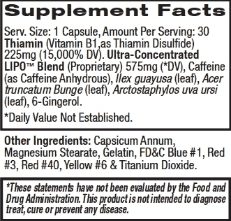 Contiene: disúlfido de tiamina, Geranio, Amla (extracto 10:1), sinefrina, metilsinefrina y yohimbina HCl. *