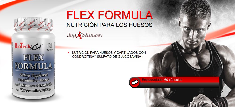 Flex Formula de BioTech USA es un suplemento a base de glucosamina sulfato, condroitin y minerales para ofrecer un soporte a la salud de los huesos y una protección de las articulaciones y elasticidad de los cartílagos.