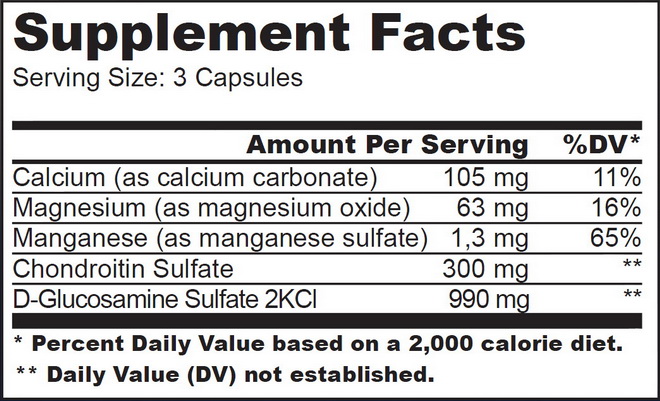 D-Glucosamina sulfato 2KCl, sulfato de condroitina, carbonato de calcio, oxido de magnesio, sulfato de magnesio, gelatina (cápsula), antiaglomerante (estearato de magnesio).