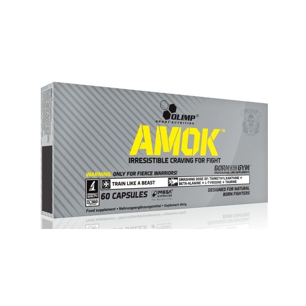 Amok™ de Olimp® Sport Nutrition es un suplemento en cápsulas de preentrenamiento que contiene unas dosis elevadas de cafeína para incrementar el rendimiento y reducir el cansancio. También contiene otros ingredientes que elevan los niveles de energía como el extracto de ginseng coreano, el guaraná, la beta-alanina o la vitamina B6.