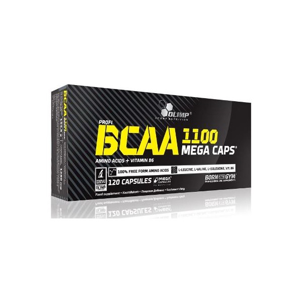 BCAA 1100 Mega Caps de Olimp® Sport Nutrition es un suplemento en cápsulas que te proporciona 3,3 gramos de aminoácidos de cadena ramificada en forma libre (leucina, valina, isoleucina) en proporción de 2:1:1 y enriquecidos con vitamina B6, por dosis de 3 cápsulas.