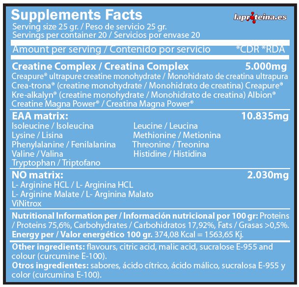 Disfruta de esta excelente mezcla de creatinas avanzadas, aminoácidos esenciales y potenciadores de la producción de óxido nítrico en tu tienda online de confianza: "Laproteina.es"