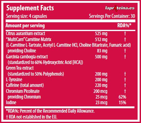 Extracto de fruta de Citrus aurantium (contiene 4% de sinefrina), extracto de fruta de Garcinia cambogia, agente de recubrimiento (gelatina bovina; colorantes: dióxido de titanio, óxido rojo de titanio, rojo allura AC**), bitartato de colina, extracto de hoja de Camellia sinensis, L-tirosina, cafeína anhidra, L-carnitina L-tartato, acetil L-carnitina HCl, ácido fumárico, yoduro de potasio, picolinato de cromo.