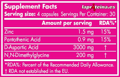 Ácido D-aspártico, N,N-dimetilglicina HCL, antiaglomerante (estearato de magnesio), monohidrato de sulfato de zinc, D-pantotenato de calcio, agente de recubrimiento (gelatina).