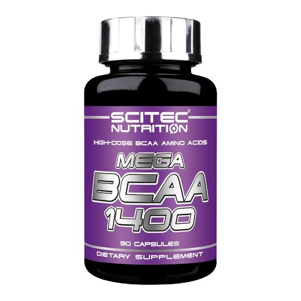 Mega Bcaa 1400 de Scitec Nutrition contiene 1250 mg de aminoácidos de cadena ramificada en la proporción 2:1:1 entre Leucina, Valina e Isoleucina por cápsula enriquecidos con las vitaminas B5, B6 y B12.