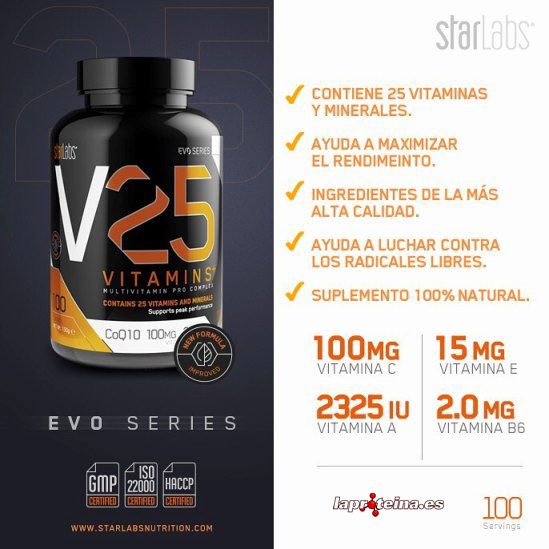 V25 Vitamins+ de StarLabs te proporciona un completo espectro de vitaminas y minerales para mantener la vitalidad y mantener tu cuerpo sano. Cualquier persona que lleve una vida activa es importante que consiga todos los nutrientes que su cuerpo necesita a diario.