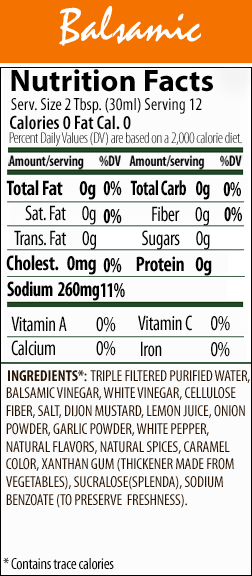 Agua purificada triple filtrado, vinagre balsámico, vinagre, sal, gel de celulosa, mostaza dijon, jugo de limón, cebolla en polvo, ajo en polvo, pimienta blanca, sabores naturales, especias naturales, color caramelo, goma xantana, alginato de propilenglicol y sucralosa.
