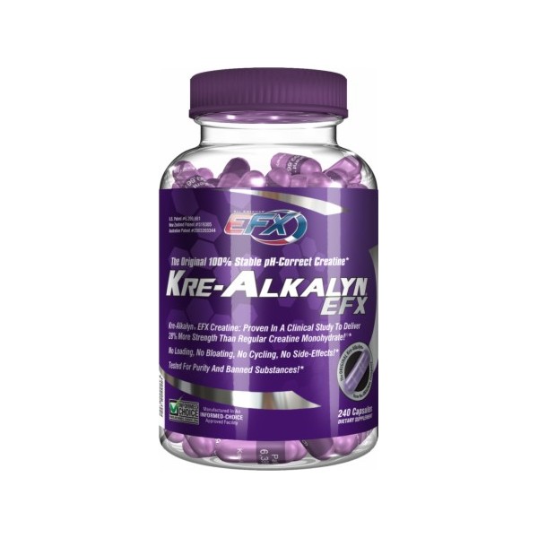 Kre-Alkalyn EFX es un neutralizador de creatina que no la convierte en creatinina antes de alcanzar el tejido muscular del cuerpo. Se presenta en cápsulas moradas de administración oral.