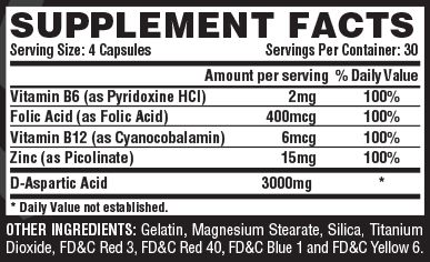 Ácido D-aspártico, vitamina B6 (Hidrocloruro de Piridoxina), Ácido Fólico, Vitamina B12 (Cianocobalamina), Zinc (Picolinato de Zinc), gelatina, estearato de magnesio, sílice, dióxido de titanio, FD&C Rojo #3, FD&C Rojo #40, FD&C Azul #1, FD&C Amarillo #6.