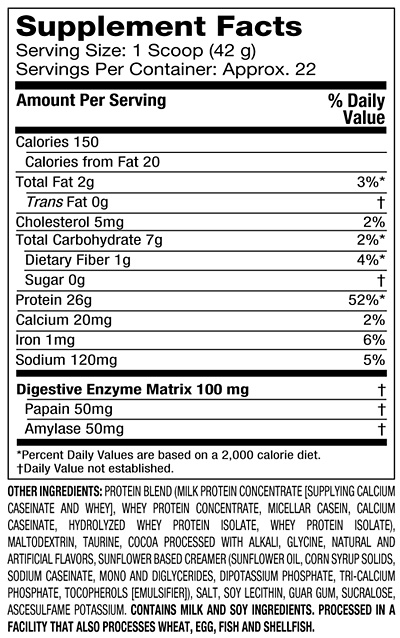 Mezcla de proteínas (concentrado de proteína de leche [Suministro de caseinato de calcio y suero de leche], concentrado de proteína de suero, caseína micelar, caseinato de calcio, proteína de suero de leche hidrolizada, aislado de proteína de suero aislado), maltodextrina, Taurina, sabores naturales y artificiales, crema de girasol (aceite de girasol, sólidos de jarabe de maíz, caseinato de sodio, mono y diglicéridos, fosfato dipotásico, fosfato tricálcico, tocoferoles [Emulsionante]), sal, lecitina de soja, goma guar, sucralosa, acesulfamo de potasio. Contiene leche y soja. Se procesa en una instalación que también procesa trigo, huevo, pescado y mariscos.