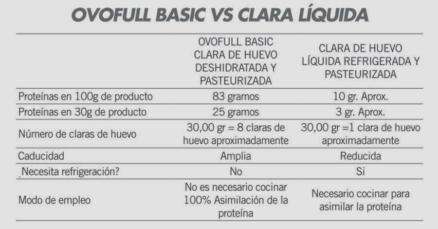 Los productos que componen la familia Ovofull son muy bajos en grasas, están libres de lactosa, no contienen gluten, no contienen sustancias dopantes, están libres de salmonella, se conservan a temperatura ambiente (sin refrigeración) y la fecha de caducidad del producto es bastante extensa comparada con las claras liquidas.