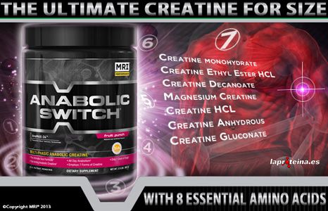 El nuevo Anabolic Switch® de MRI Performance es un potente voluminizador multi-fase que contiene 7 tipos diferentes de las mejores formas de creatina, una mezcla patentada de aminoácidos esenciales, beta-alanina como Carnosyn®, taurina y arginina alfa cetoglutarato.