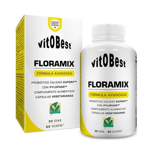 FloraMix de Vitobest es un suplemento en cápsulas que combina una extraordinaria mezcla probiótica de 6 cepas de eficacia probada en estudios clínicos, con inulina y Pylopass™ (lactobacilus reuteri) un compuesto patentado y único que contribuye a combatir la gastritis y la úlcera péptica por helicobacter pylori.