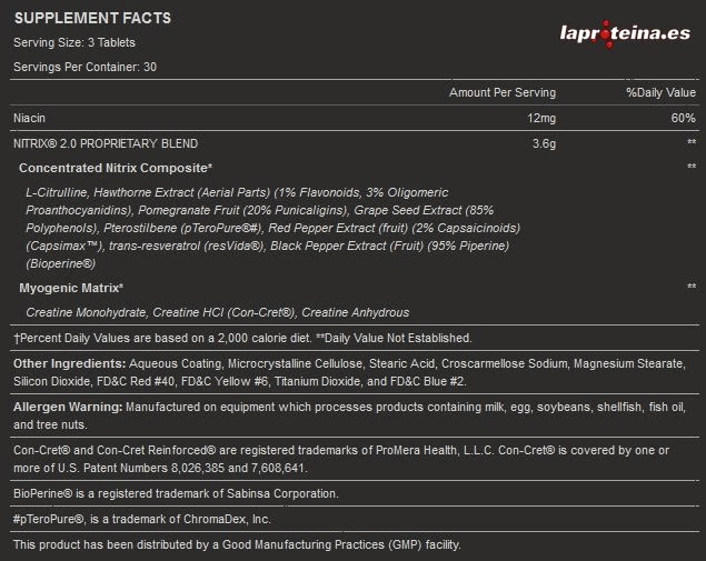 La primera de ellas denominada "Concentrated Nitrix Composite" contiene L-citrulina, extracto de Espino Blanco (partes aéreas) (1% de flavonoides, 3% proantocianidinas oligoméricas), fruto de Granada (Punicaliginas 20%), extracto de semilla de uva (85% polifenoles), pterostilbeno (pTeroPure®), extracto de Pimienta Roja (fruto) (capsaicinoides 2%) (Capsimax™), trans-resveratrol (resVida®), extracto de Pimienta Negra (Fruto) (95% piperina) (Bioperine®).